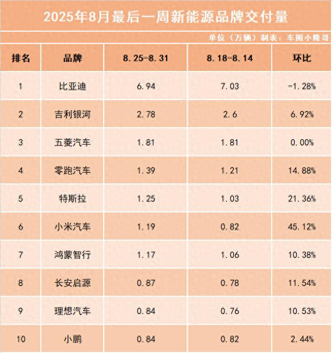 - 2025-09-087月最后一周新能源品牌榜: 小米汽车周销量首破万!